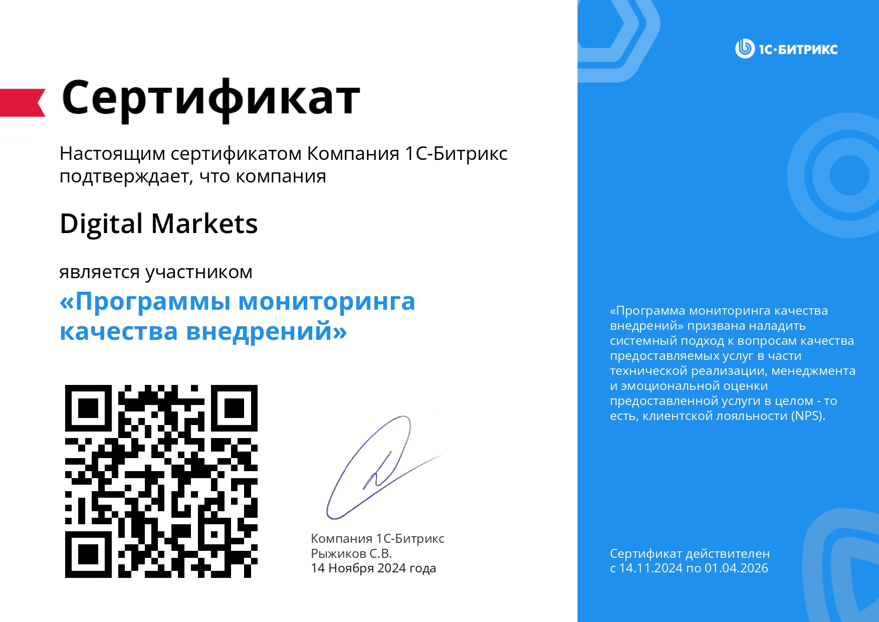 Компания Didgital Markets владеет компетенцией "Интеграция 1С", предоставляющаяся партнерам, успешно разрабатывающим интернет-проекты, включающие взаимодействие или интеграцию с программными продуктами фирмы «1С».
