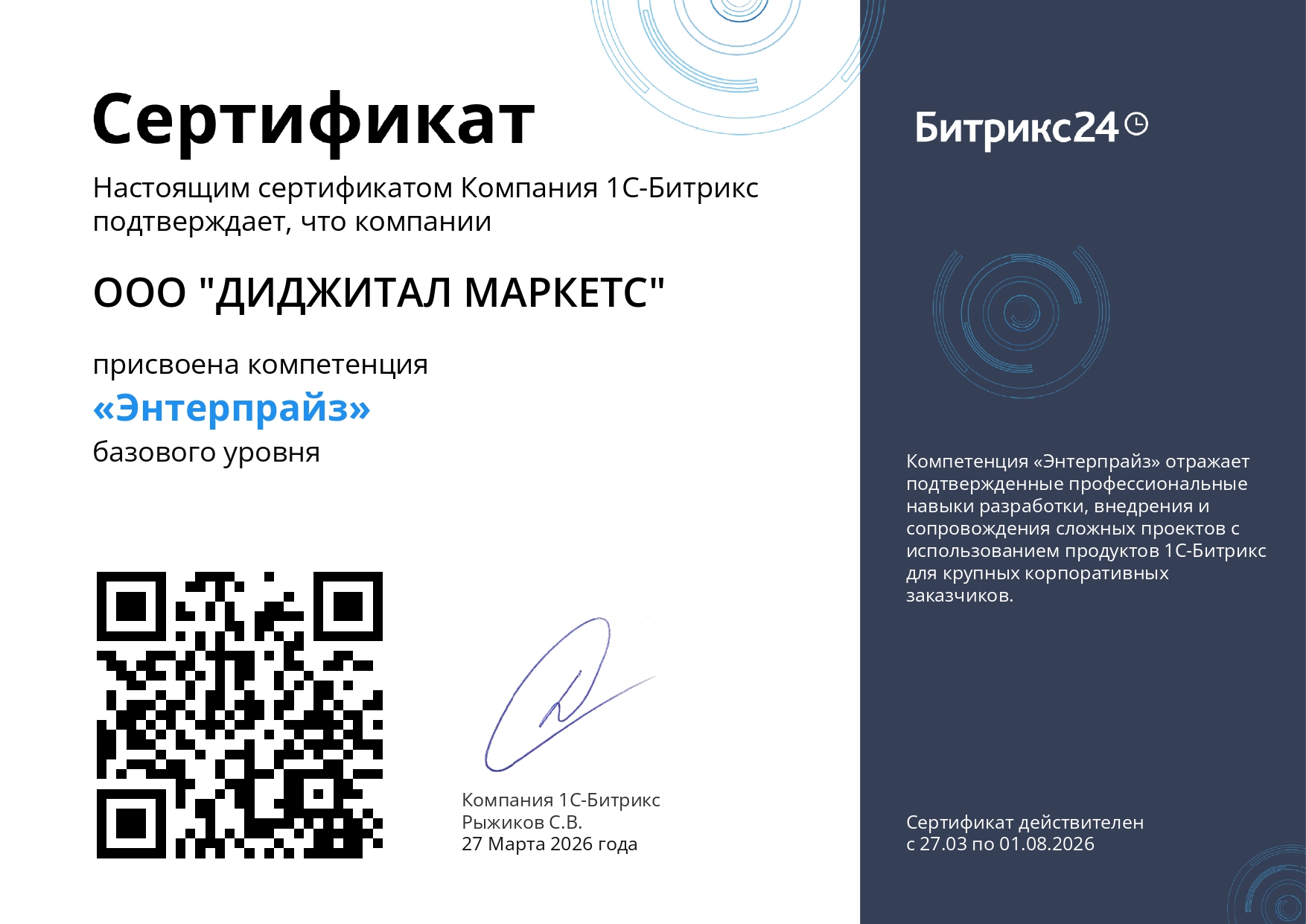 Компания “Диджитал Маркетс” обладает богатым опытом создания сайтов различной направленности, в том числе и для государственного сектора. Являясь сертифицированным партнером компании Битрикс, наша компания имеет компетенцию «Решения для государственных организаций» которая предоставляется партнерам, успешно создающим индивидуальные интернет-проекты на платформах «1С-Битрикс» для государственной организаций и учреждений, что подтверждает нашу высокую квалификацию в данных вопросах.